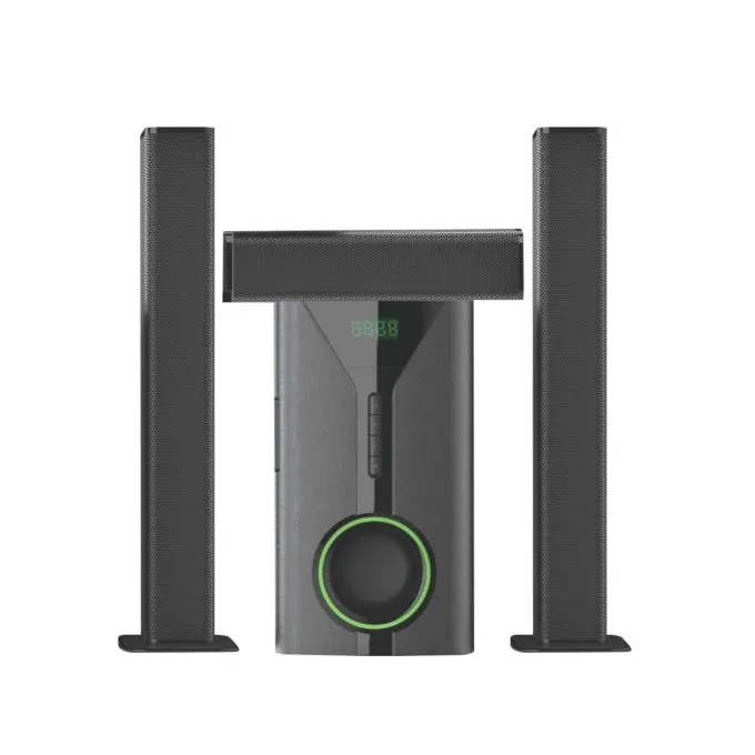 The system is compatible with a range of devices, supporting MP3, DVD, VCD, PS2, XBOX, SD cards, USB, and FM Radio. Equipped with Bluetooth connectivity and multiple input options, this soundbar allows seamless connections to smartphones, TVs, and gaming consoles. A handy remote control adds convenience, making it easy to adjust volume, switch modes, and control playback from across the room. The sleek design and high-quality sound output make this home theater system a perfect addition to any living space.