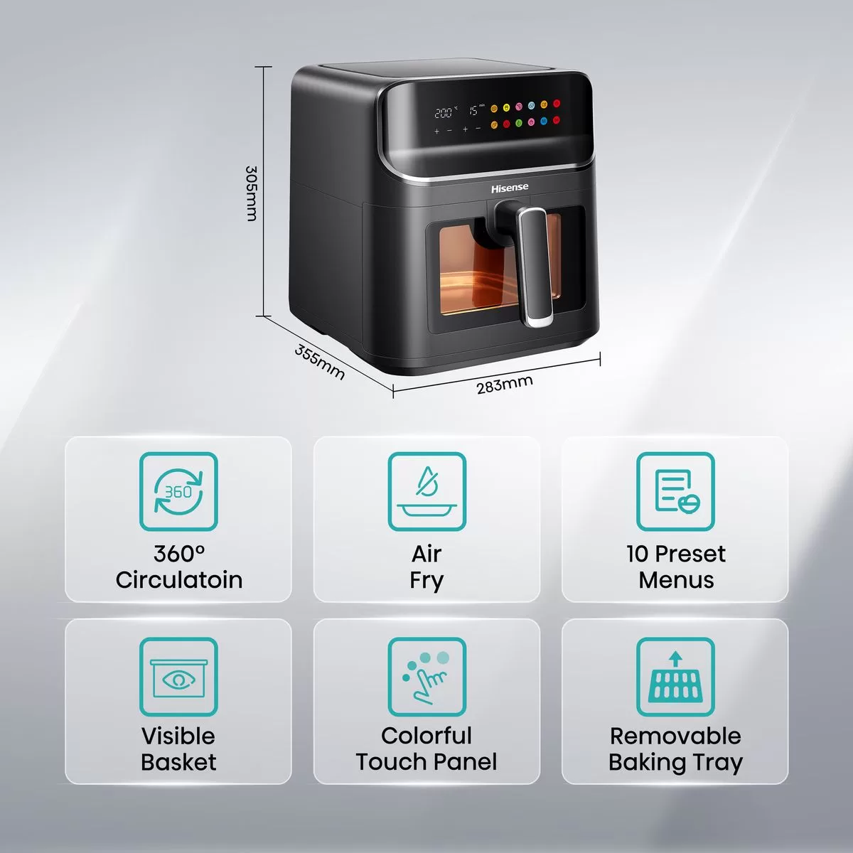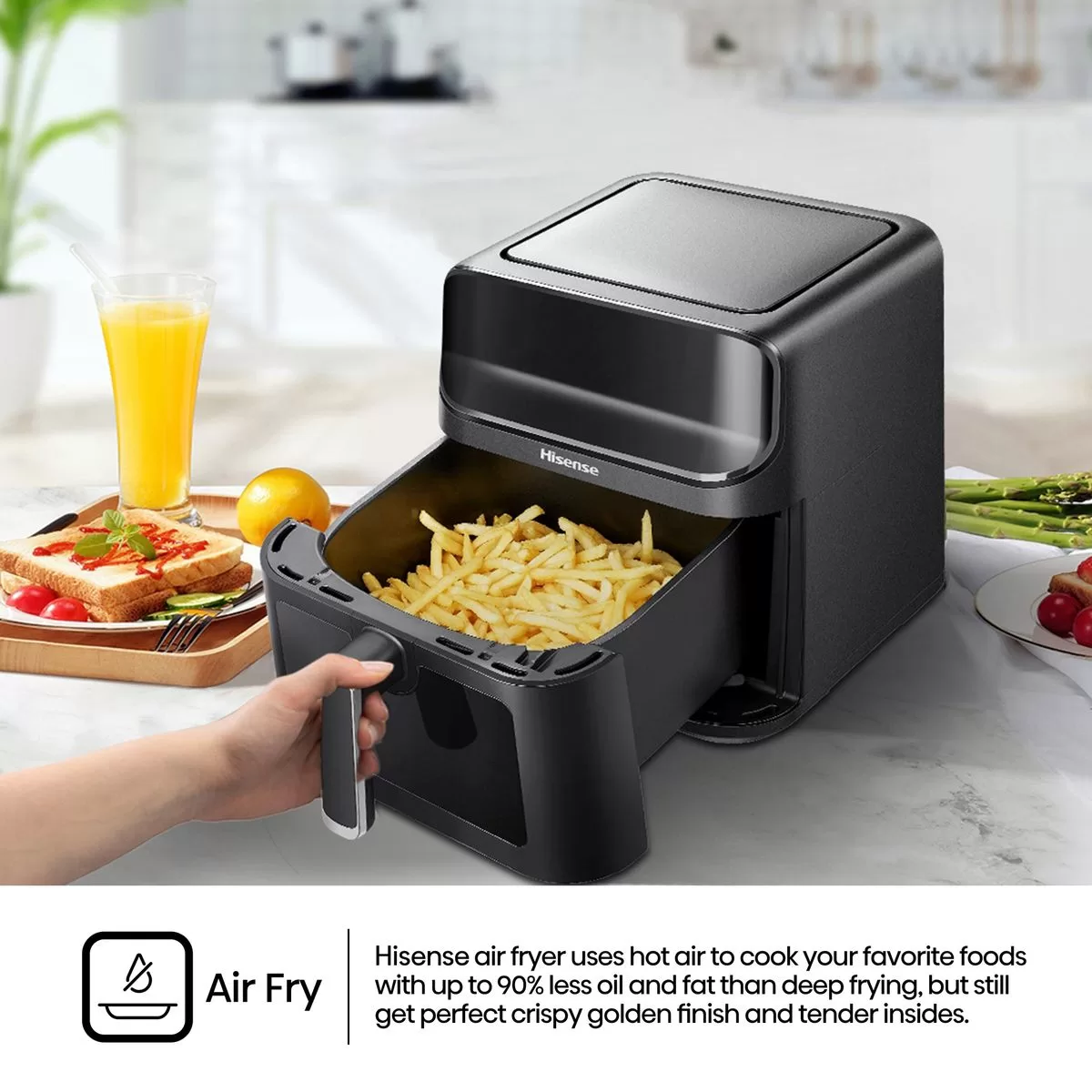 Air Fry Hisense air fryer uses hot air to cook your favorite foods with up to 90% less oil and fat than deep frying, but still get perfect crispy golden finish and tender insides.