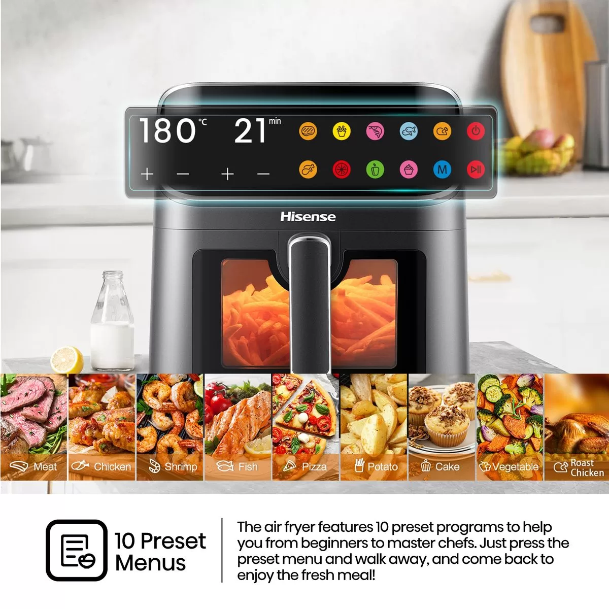 10 Preset Menus The air fryer features 10 preset programs to help you from beginners to master chefs. Just press the preset menu and walk away, and come back to enjoy the fresh meal!