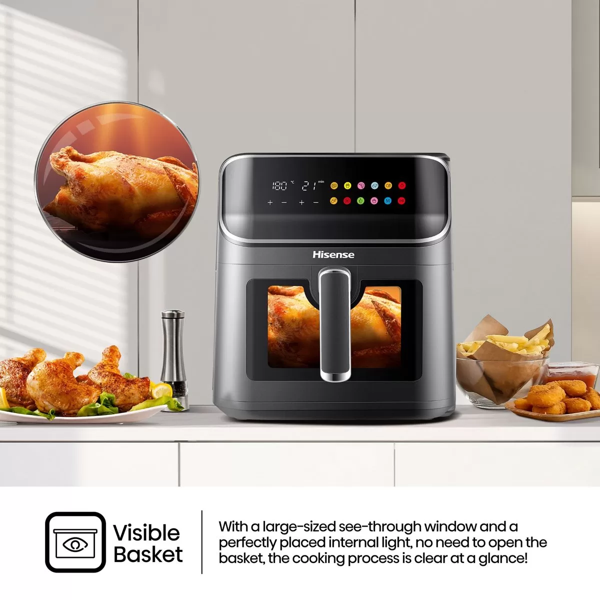 Visible Basket With a large-sized see-through window and a perfectly placed internal light, no need to open the basket, the cooking process is clear at a glance!