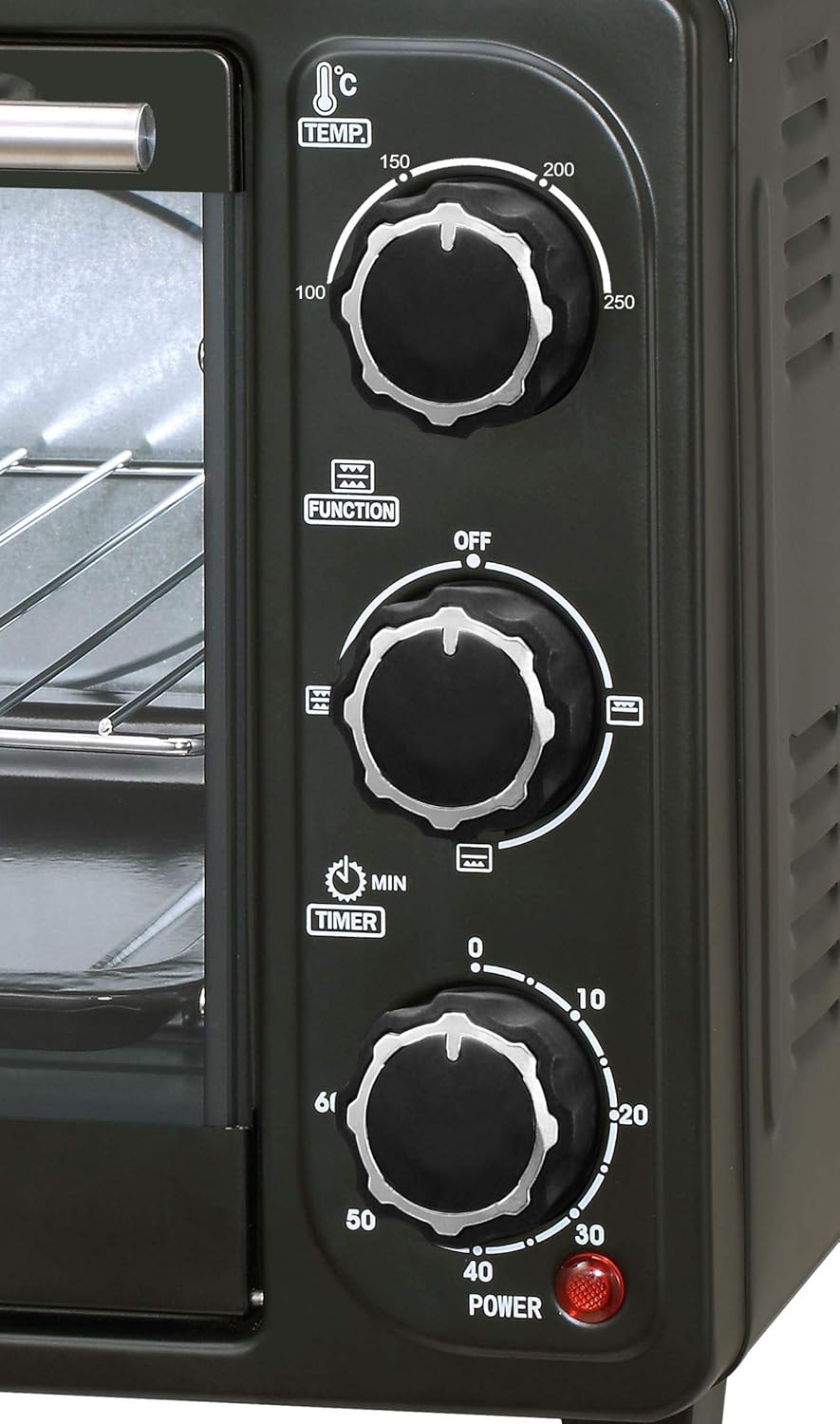 - Smart Design: This sleek stainless-steel electric oven comes with interior lighting that shows you how perfectly your food is cooking. It features a bell ring that indicates the completion of a cooking cycle. The timer can be set for about 60 minutes at a single time and it also embraces a 100 to 250-degree Celsius adjustable temperature selector.