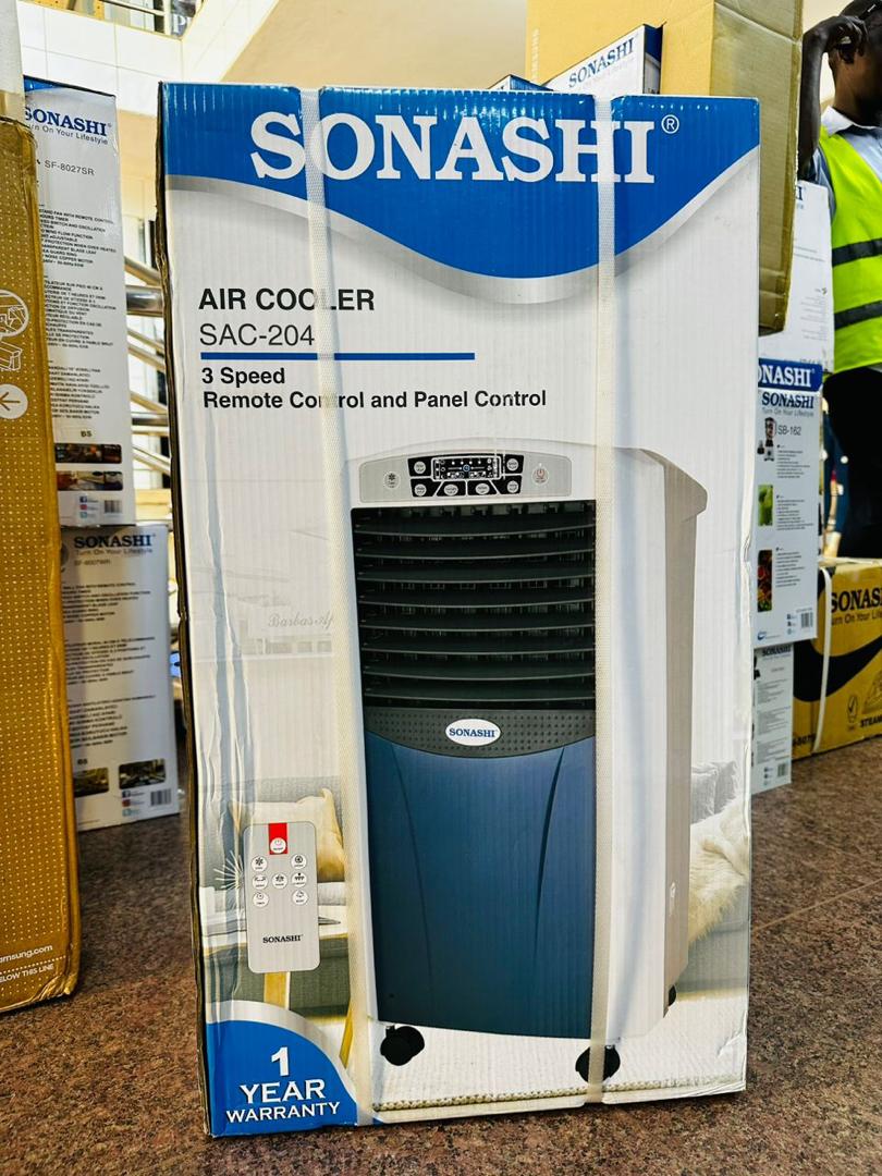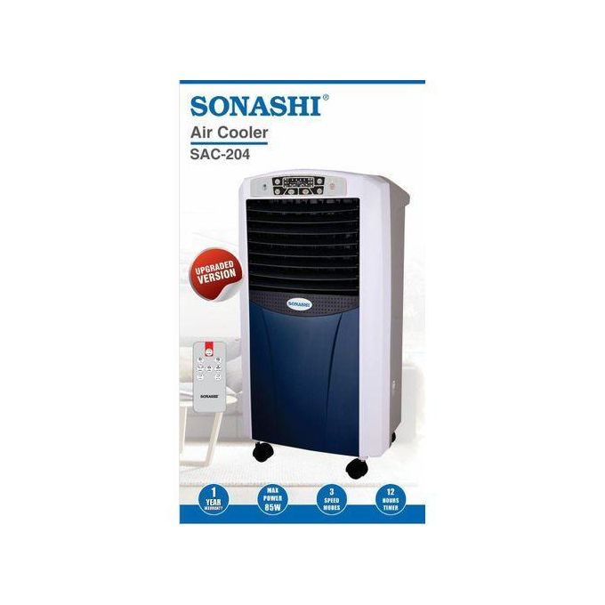 - Product Specifications: Sonashi 7L Air Cooler comes with a remote for easy use and operates on AC 220-240V of power. Its honeycomb pad absorbs heat from the air causing the water to evaporate, so keep an eye on the water level indicator to keep the water tank full and clean.