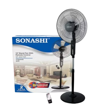 - Product Specification: The Sonashi stand fan with remote control measures 16 in. in height and comes in a sleek black colour. It works efficiently and produces a low noise as it operates on an in-built 60W copper motor.