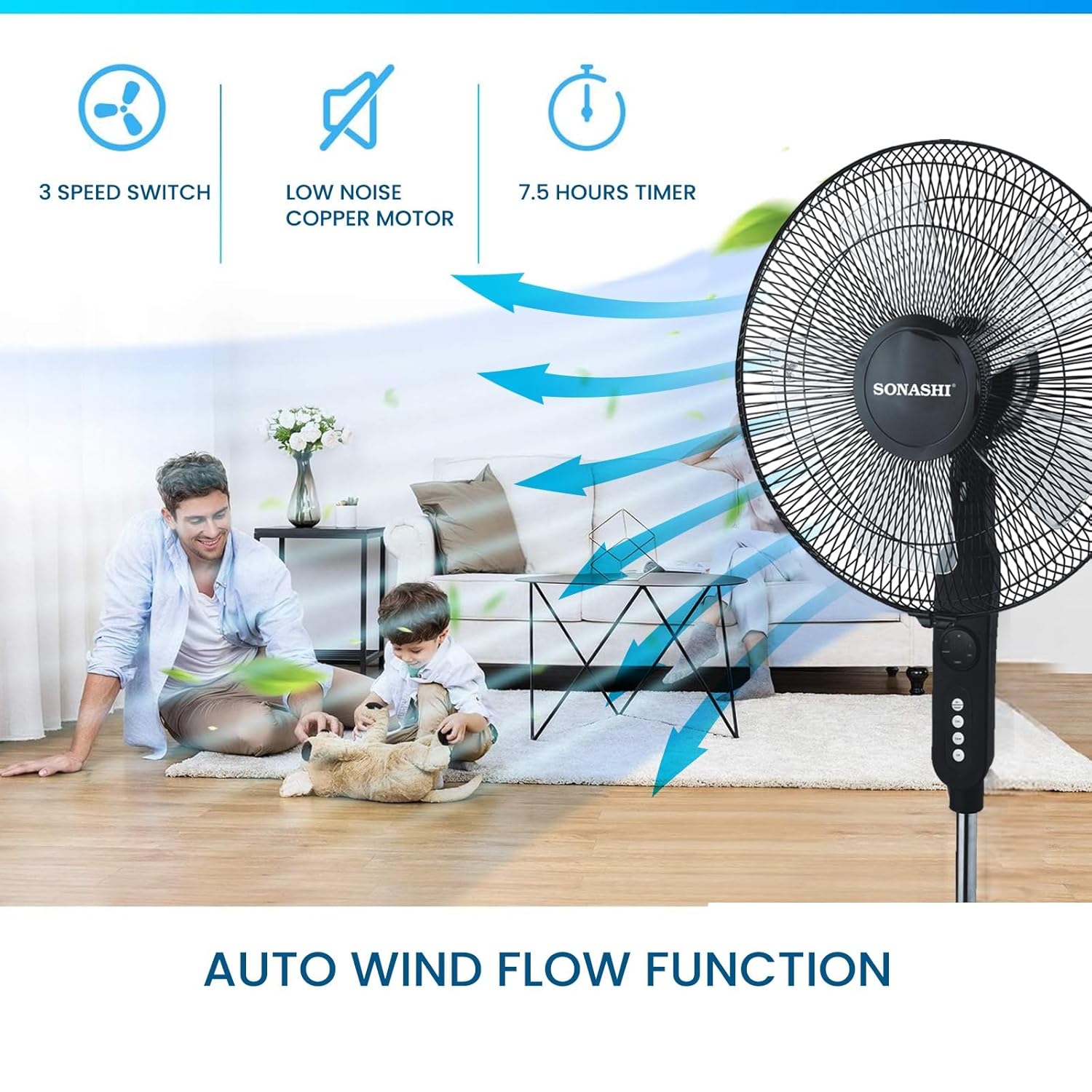 SONASHI Stand Fan 16 inch Floor Fan with Remote Control, 3 Speed Switch, Auto Wind Flow Function, 5 Transparent Blade Leaf – SF-8027SR [Black]