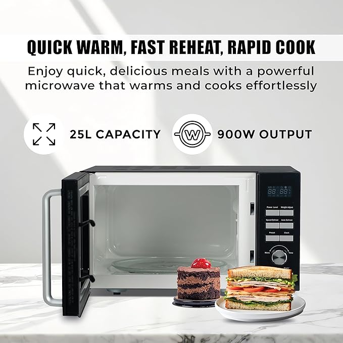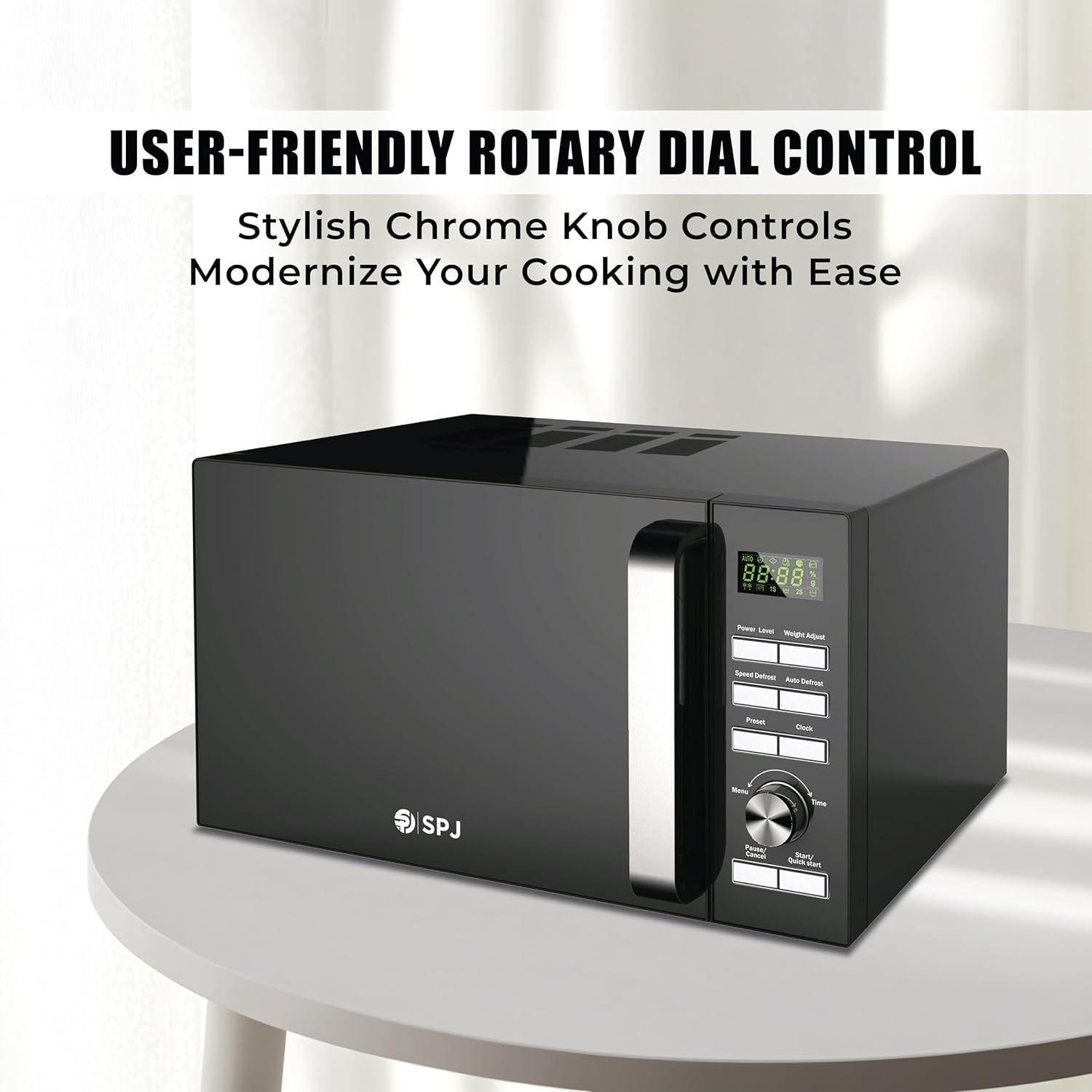 Featuring a generous 25-liter capacity, the SPJ Microwave provides ample space to cook, reheat, and defrost your favorite meals effortlessly. Say goodbye to long hours spent in the kitchen and hello to quick and convenient cooking.